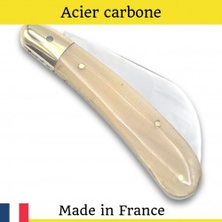 Vous allez tomber sous le charme de cette serpette en corne claire. Chaque pièce est unique grâce aux reflets naturels du manche. Sa lame en acier carbone offre une pénétration sans effort et une coupe franche, fidèle à la forme historique que vous connaissez. C'est l'outil de prédilection pour ceux qui cherchent la durabilité d'un objet de grande valeur et la fierté d'un artisanat français authentique.