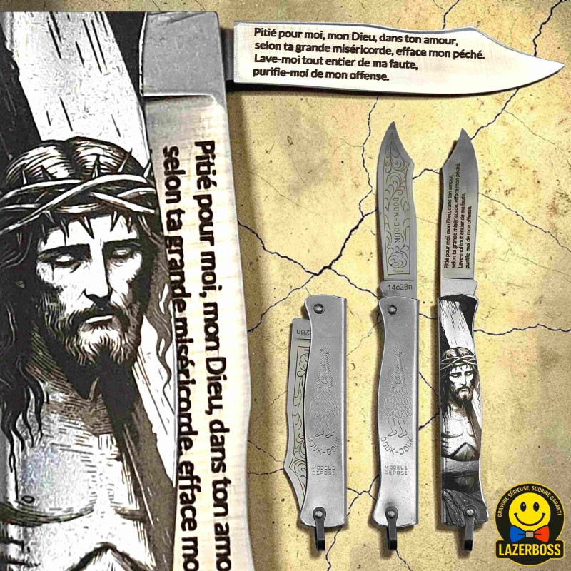 L'icône de la coutellerie française rencontre l'art sacré. Découvrez le Douk-Douk revisité par le studio Lazerboss. Un couteau mythique, léger comme une plume et solide comme un tank, magnifié par une gravure laser ultra-précise du Christ et des versets du Psaume 51. Disponible en version 16 cm (format porte-monnaie) ou 20 cm (format classique), c'est l'alliance parfaite entre un tranchant rasoir et un objet de foi indestructible.