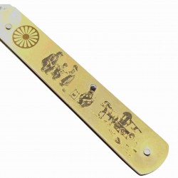 Son manche en laiton est orné d’une gravure laser minutieuse représentant une scène pleine de vie et de liberté : un cheval attelé à une roulotte, et un feu de camp.