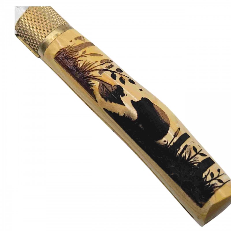 Voici une pièce rare, brute et poétique. Ce José Da Cruz a été façonné à partir d’une branche complète de buis, conservant son écorce naturelle, son âme, sa courbe. Dans ce bois chaleureux et vivant, nos graveurs ont fait naître un Niglo – le hérisson des gens du voyage – avançant dans la forêt. Un décor fin, discret, mais profondément expressif, gravé à même le bois comme un talisman de route.