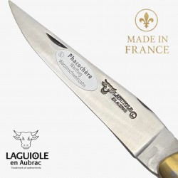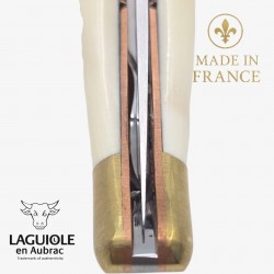 Ce couteau de 12 cm est bien plus qu’un bel objet : c’est l’expression d’un savoir-faire rare. Le manche est encadré par deux mitres en laiton brillant, prolongé par deux platines en cuivre massif, soigneusement guillochées à la main avec des arabesques florales et de fines lignes symétriques. Au sommet du ressort, une abeille emblématique rayonne grâce à un ciselage raffiné et lumineux, révélant toute la minutie du coutelier.