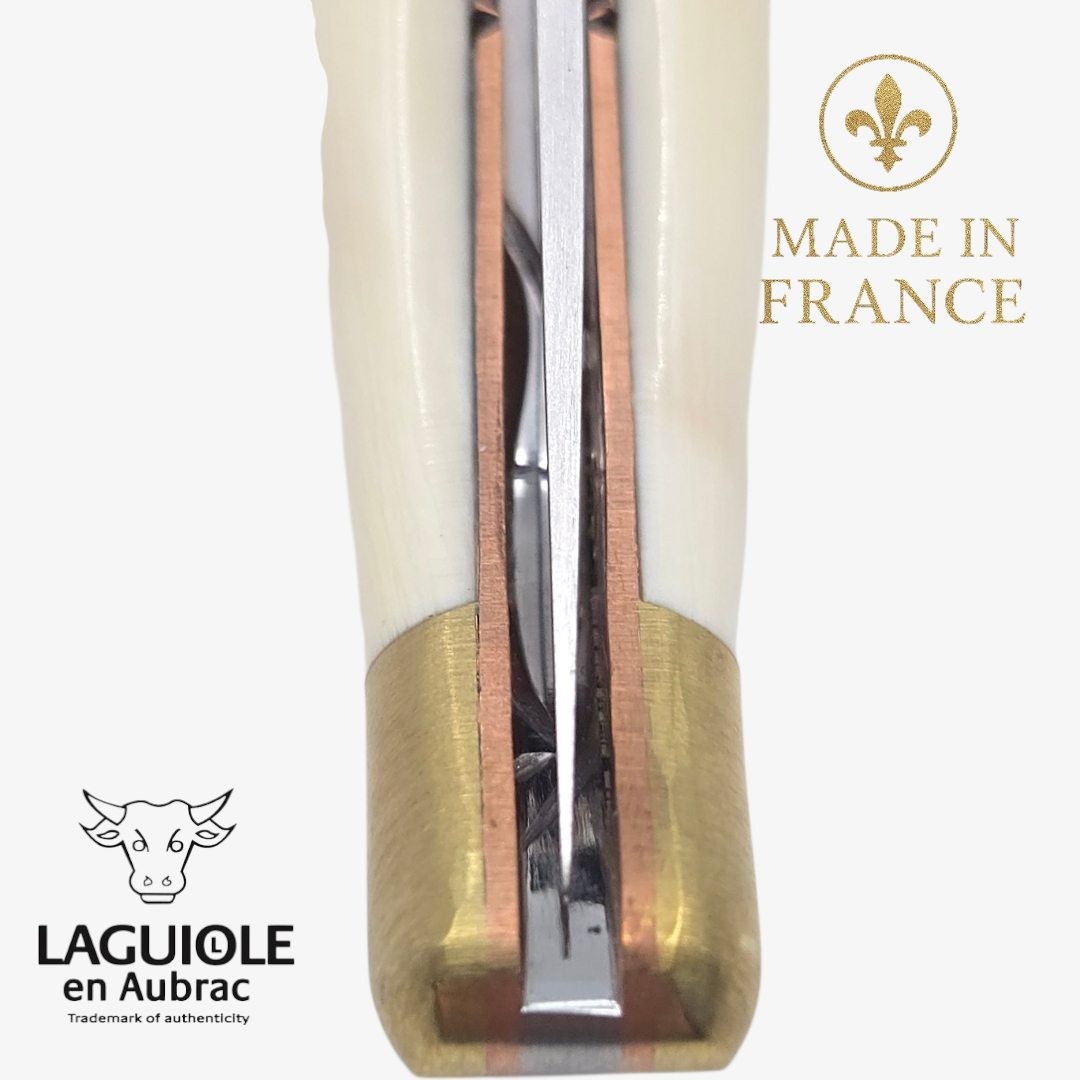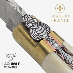 Le Bijou porte bien son nom. Cette création lumineuse signée Laguiole en Aubrac mêle finesse artisanale et esthétique précieuse, dans une harmonie de trois métaux nobles : laiton doré, inox argenté et cuivre rosé. Inspiré des célèbres anneaux en trois ors, ce couteau évoque un bijou autant qu’un outil, avec une élégance affirmée et une dimension presque joaillière.