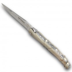 Découvrez l'apogée de la coutellerie d'art aveyronnaise avec ce Laguiole en Aubrac d'une élégance rare. Ce n'est pas un simple outil, mais une sculpture de métal et de corne où chaque ligne a été pensée pour captiver le regard. La caractéristique la plus frappante de ce modèle est son manche intégralement découpé et façonné à la main pour épouser la forme gracieuse d'une « aile de pigeon », une prouesse artisanale qui demande des heures de travail méticuleux.