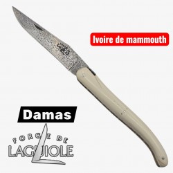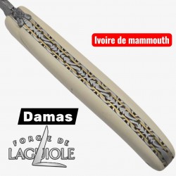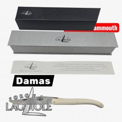 Le manche de 12 cm est façonné en ivoire de mammouth fossile. Poli avec soin, il présente une teinte ivoire naturelle, ponctuée de légères veines et nuances chaudes, qui rappellent la densité minérale d’une matière ayant traversé les millénaires. Chaque morceau d’ivoire étant unique, le rendu est strictement exclusif à ce couteau.