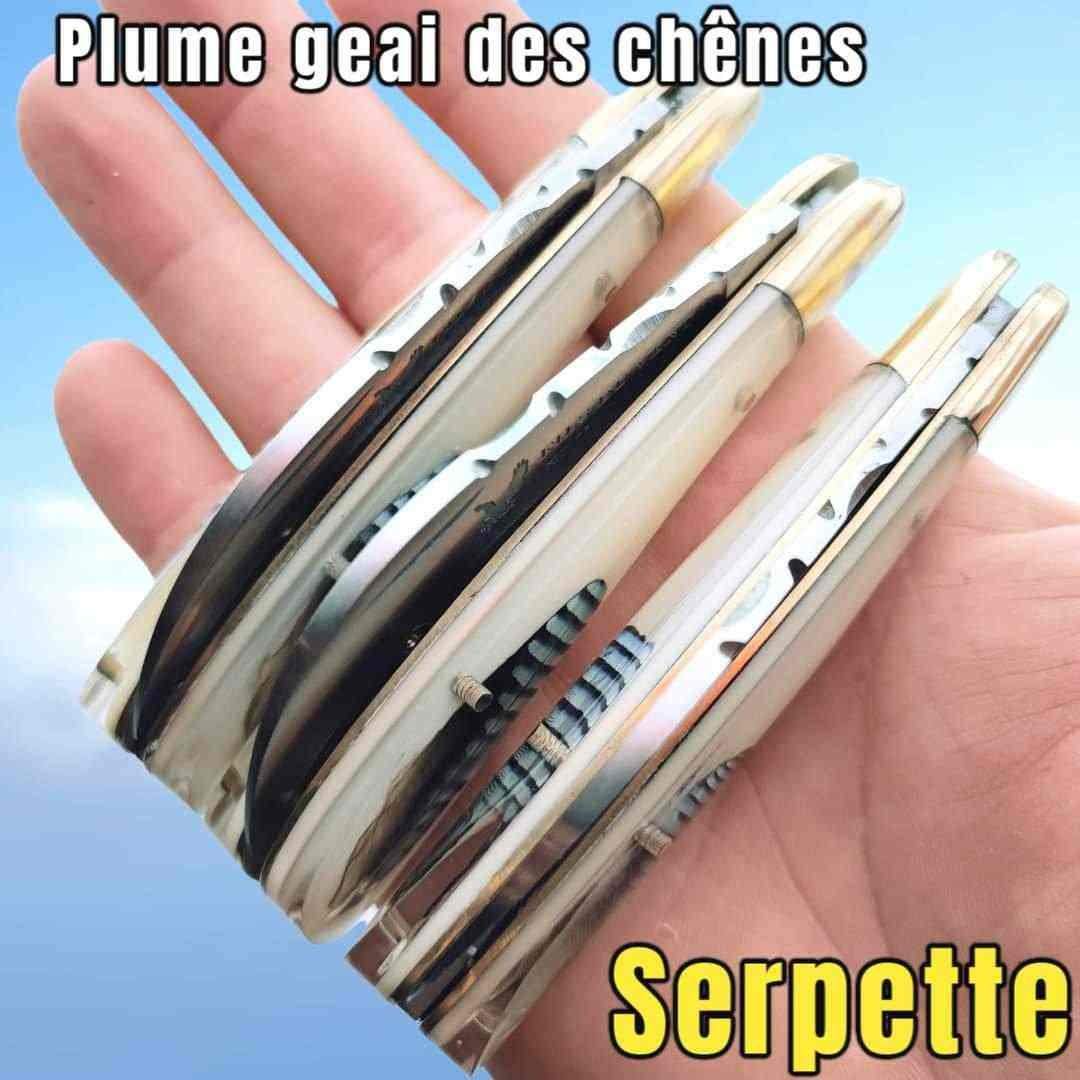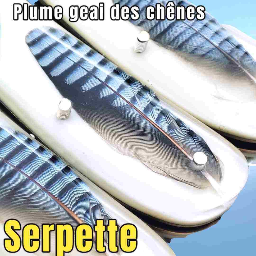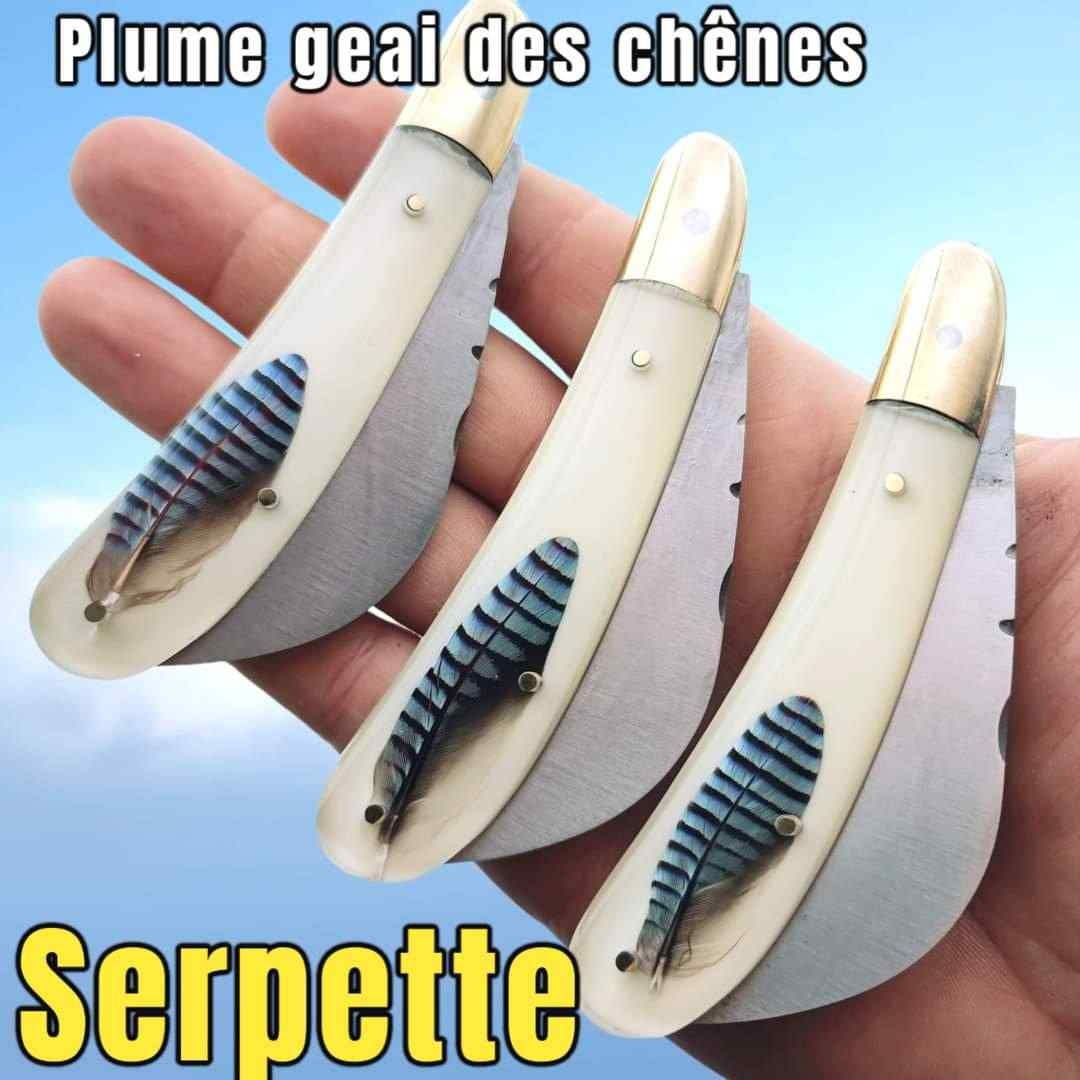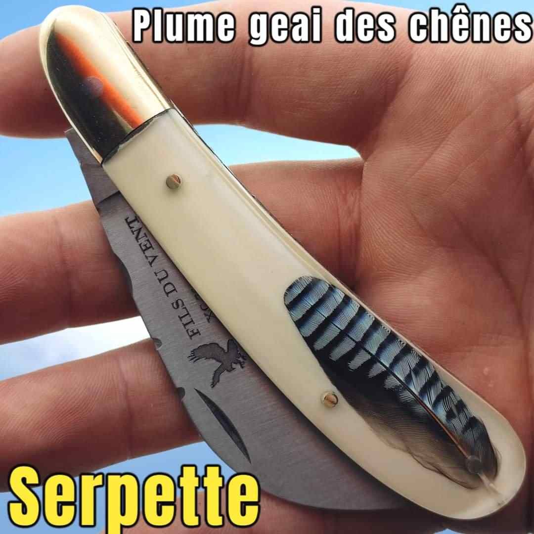Le manche est composé de chaque coté d'une plume de geai des chênes inclus dans de la résine.