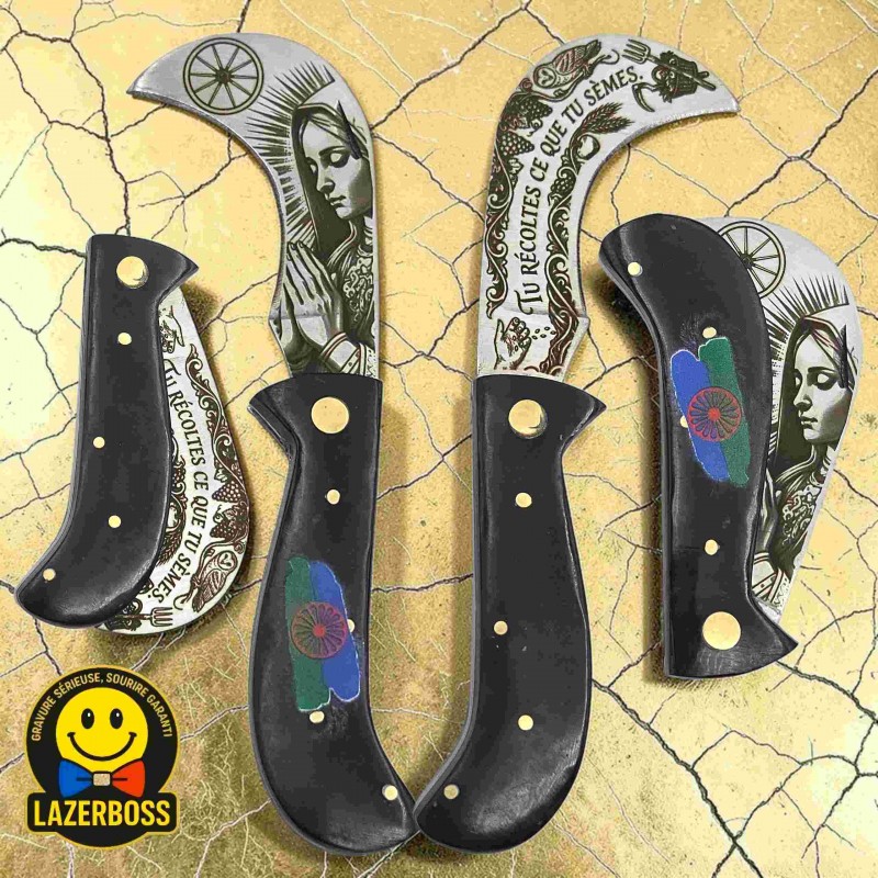 On le sait, ce qui compte, c'est ce qu'on porte dans le cœur et ce qu'on affiche avec fierté. Cette serpette n'est pas une pièce d'orfèvrerie de luxe, c'est un outil de tous les jours, rendu unique par un travail de personnalisation poussé.