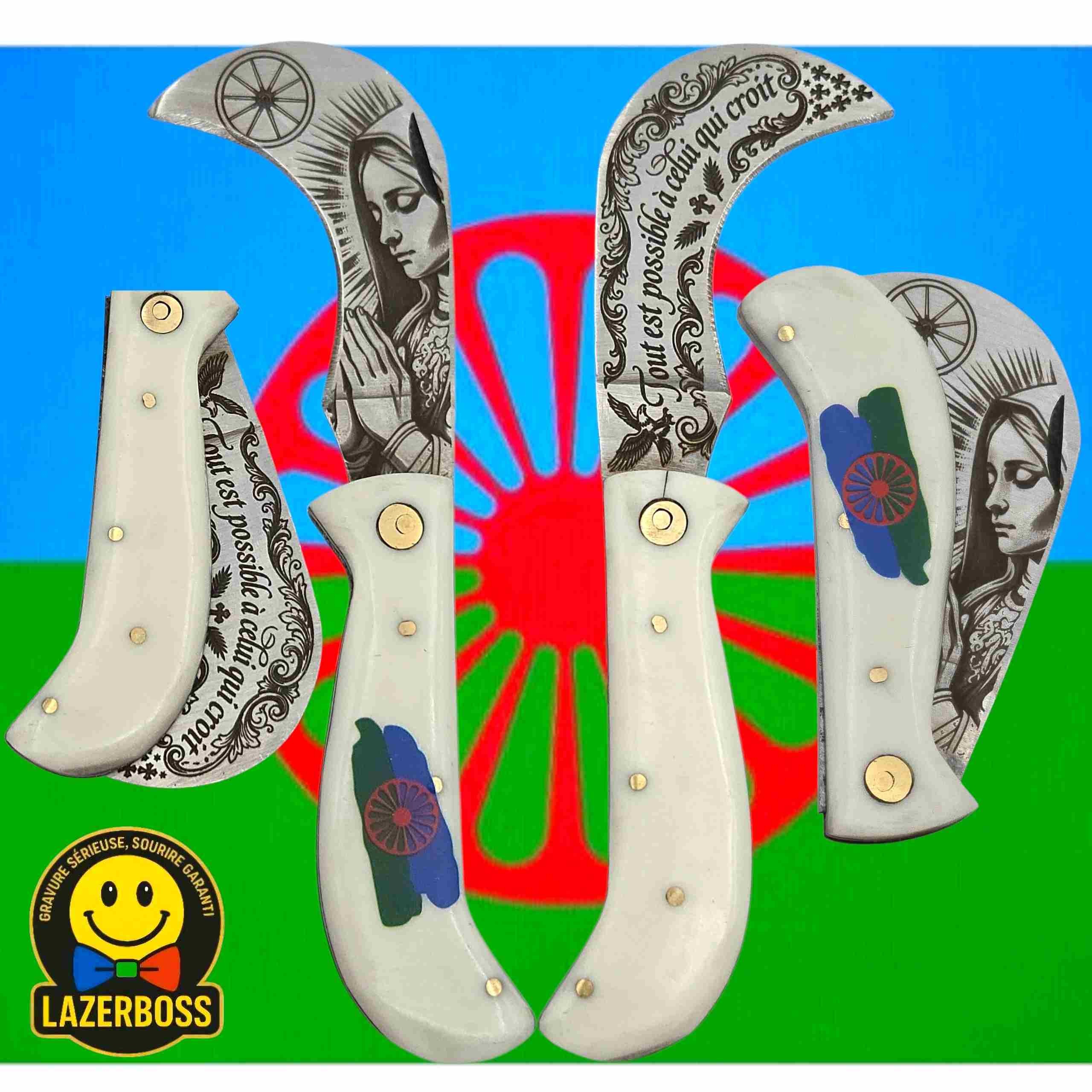 Pour cette édition spéciale, on a choisi un manche blanc immaculé qui fait ressortir les couleurs de la route. C'est une serpette simple, mais chargée d'un message puissant pour tous ceux qui ont la foi.