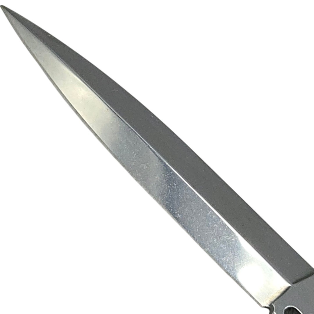 La lame en acier inoxydable adopte le profil dague, avec une pointe centrée, fine et symétrique. Polie miroir, elle déploie ses 10 cm avec autorité. Une ligne tendue et élégante, pour un couteau compact mais racé.