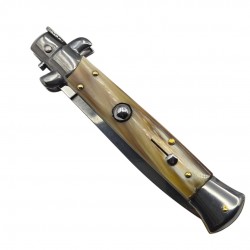 Voici une version solaire du célèbre stiletto Frank Beltrame 23 cm, avec un manche en corne blonde véritable aux reflets dorés. Léger, nerveux, élégant, ce modèle compact offre un excellent équilibre entre raffinement artisanal et efficacité mécanique.