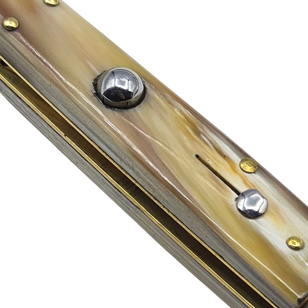 La corne naturelle blonde est réputée pour sa clarté et ses nuances subtiles allant du miel pâle au doré fumé. Chaque manche présente ses propres nervures, teintes et transparences. Aucun ne se ressemble. C’est un matériau vivant, chaleureux et noble.